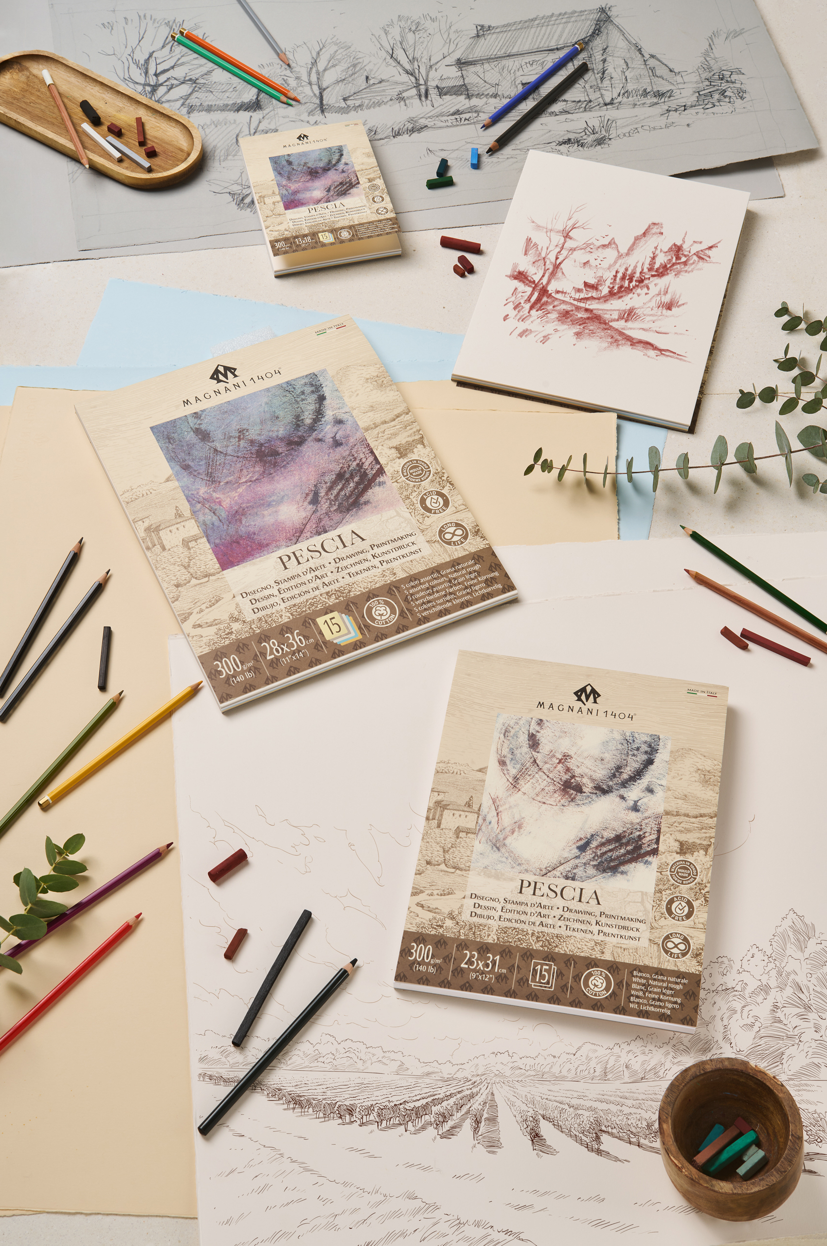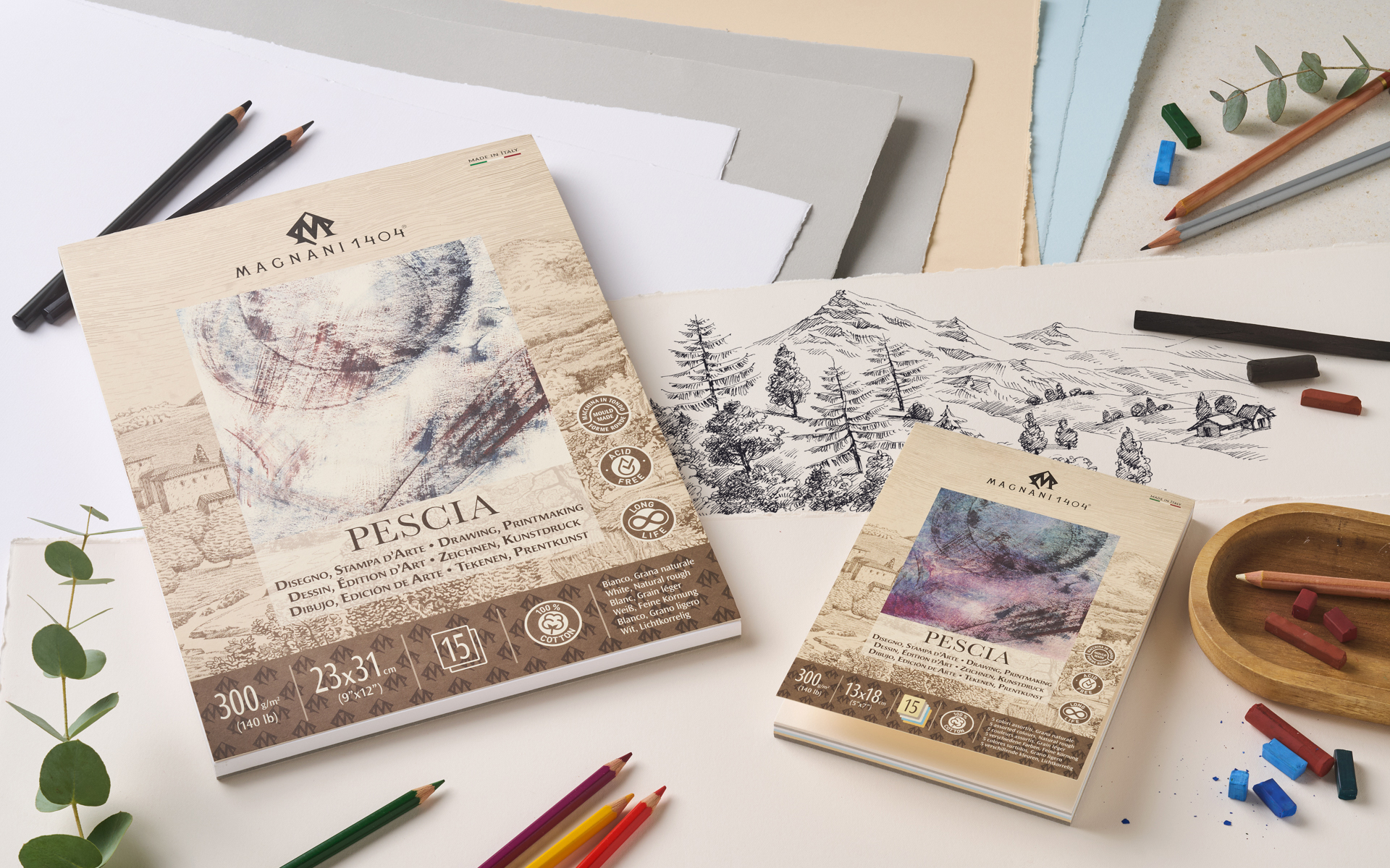 El papel Pescia es suave al tacto, se realiza en una máquina de forma redonda y su composición es de algodón al 100 %; presenta un encolado interno extremadamente ligero para proporcionar una impresión de arte óptima pero también es ideal y muy apreciada para las principales técnicas de dibujo en seco con lápiz, carboncillo, sanguina y pastel.