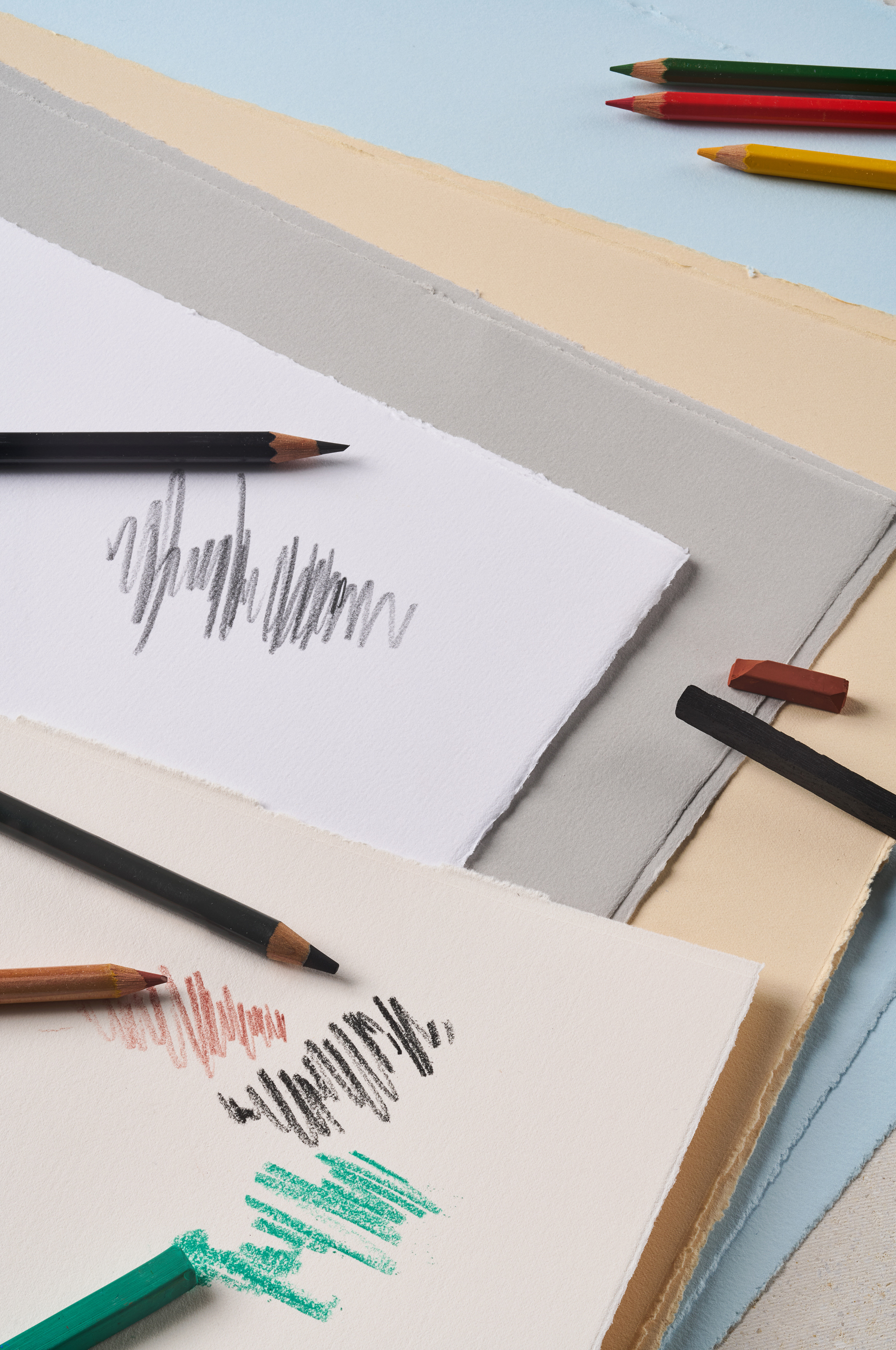 Disponible en hojas sueltas, blocs con hojas blancas o surtidas en 5 colores diferentes: blanco, marfil, crema, azul claro y gris.